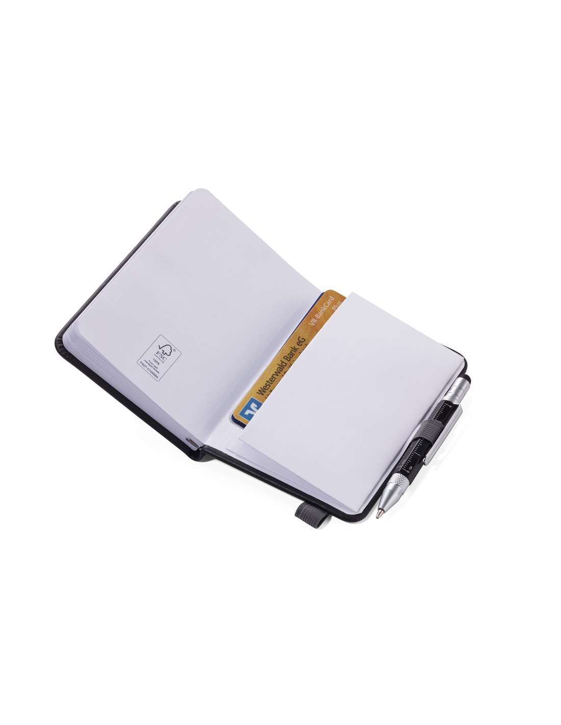 Notizblock DIN A7 inkl. Kugelschreiber, Elastikband-Verschluss, Stiftschlaufe, Lesezeichen, geprägtes Lineal (10 cm) auf Cover, FSC zertifiziertes Papier, perforierte Seiten, Punktraster, Fach für Belege, Multitasking-Kugelschreiber CONSTRUCTION LILIPUT (klein), schwarze Mine, Kunstleder, Metall, matt, schwarz