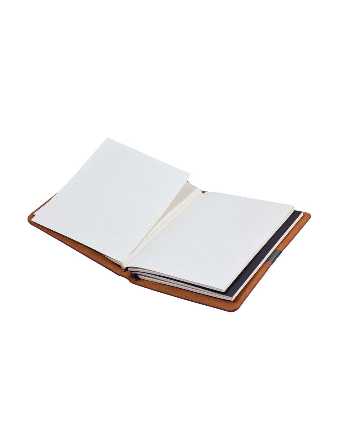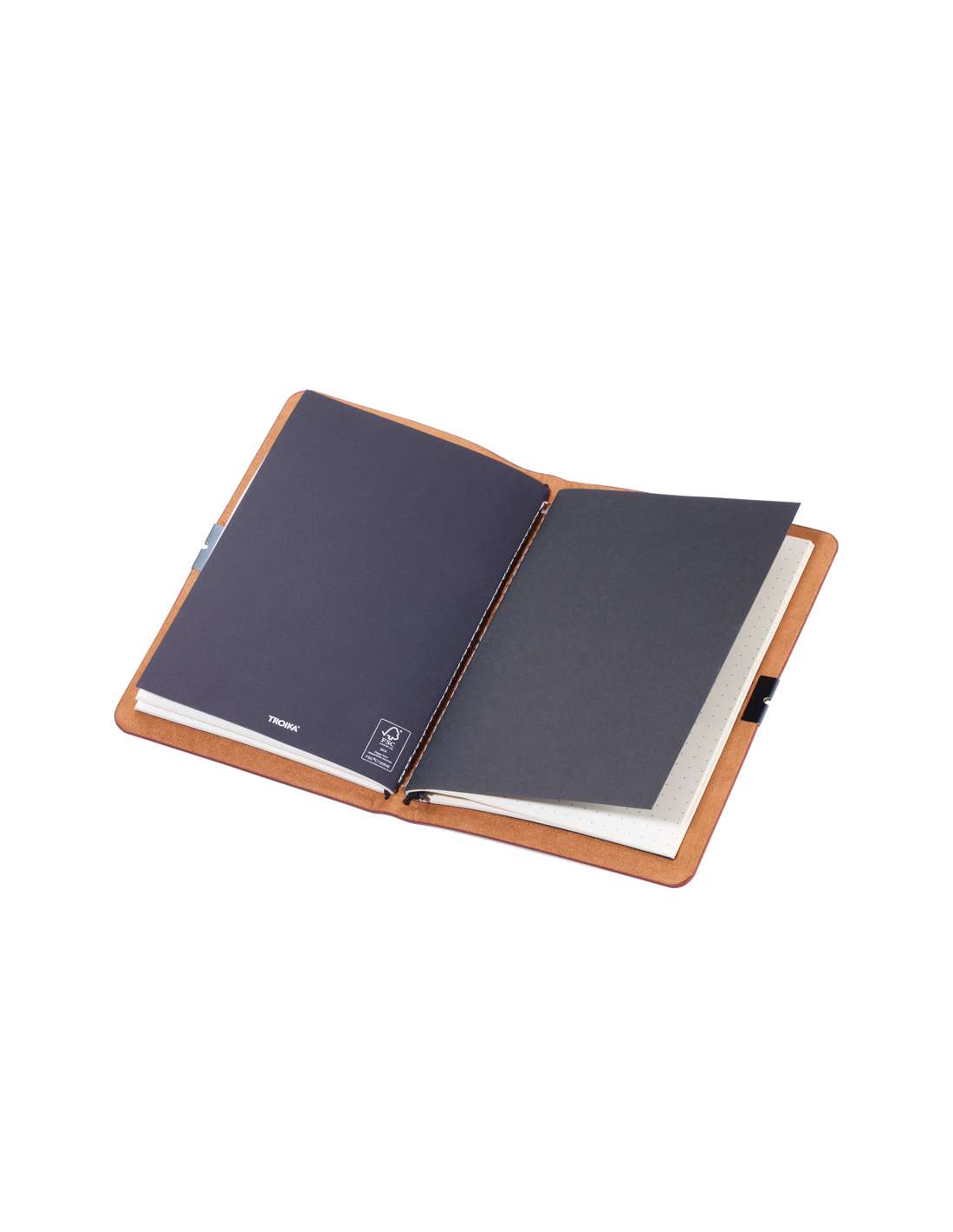 Bullet Journal bestehend aus 2 Notizbüchern DIN A5 im Kunstledereinband, pro Notizbuch: 36 perforierte Seiten, FSC zertifiziertes Papier, Punktraster, mit Gummibändern gehalten (nachfüllbar), Prägung "JOURNAL" auf Cover, Gummiband-Verschluss mit Stiftschlaufe, Edelstahl, Kunstleder, Velours, braun/schwarz