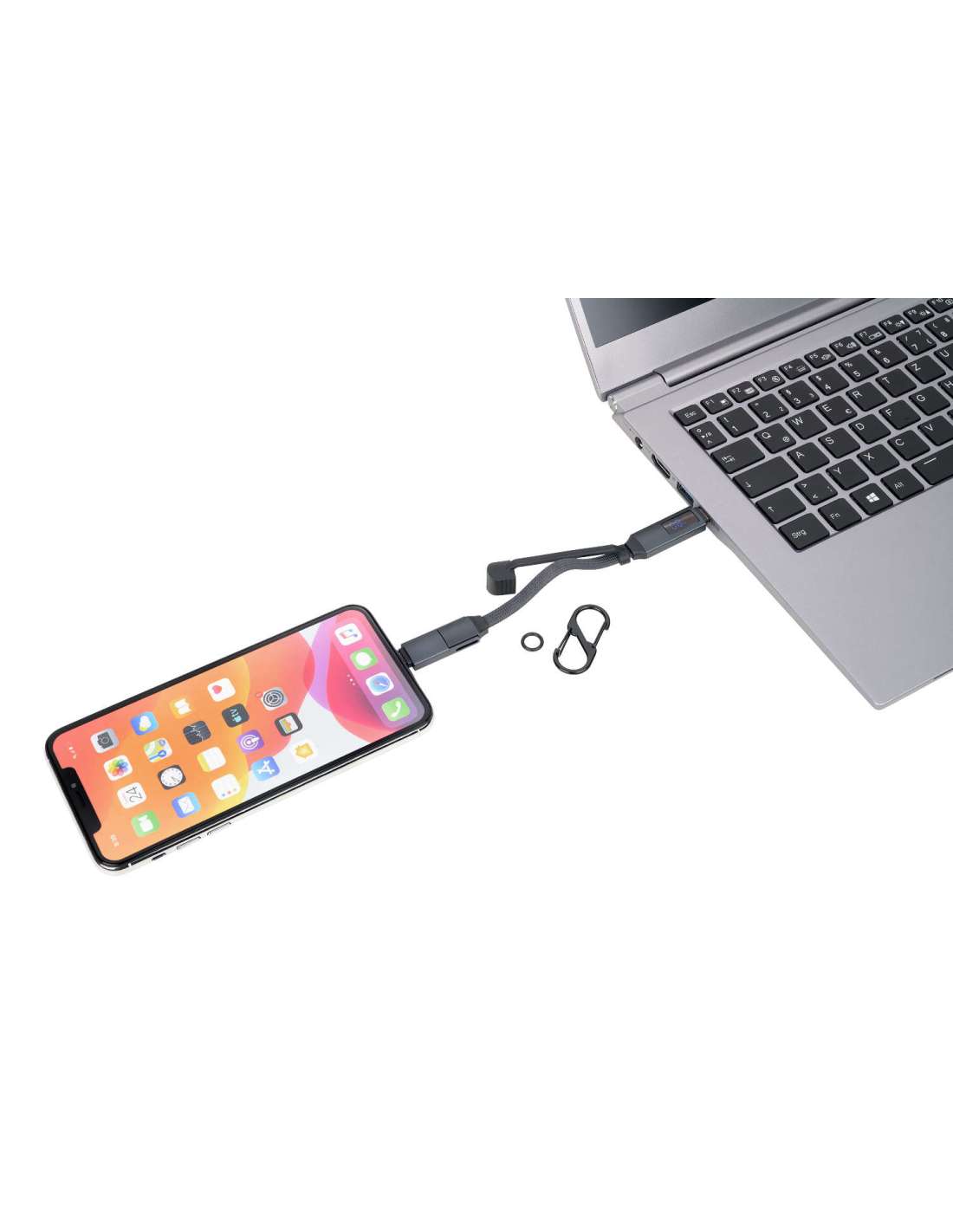 Taschenanhänger mit Ladekabel: High-Speed USB-C 60W PD Power Delivery auf USB-C, mit Datenübertragungsfunktion, volle Ladekapazität: max. 60W|20V|3A (ohne Adapter), abhängig vom zu beladenen Gerät, mit digitaler Anzeige der Ladeleistung, inkl. USB-C auf Lightning Adapter, mit Doppelkarabiner zur Befestigung an Schlüsselbund, (Sport-)Tasche o.Ä., mit Magnetverschluss und Kappe, Aluminium, recyceltes Nylon, schwarz/titanfarben
