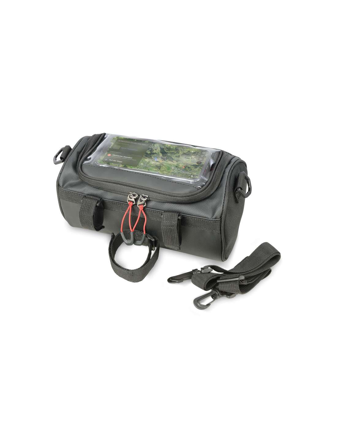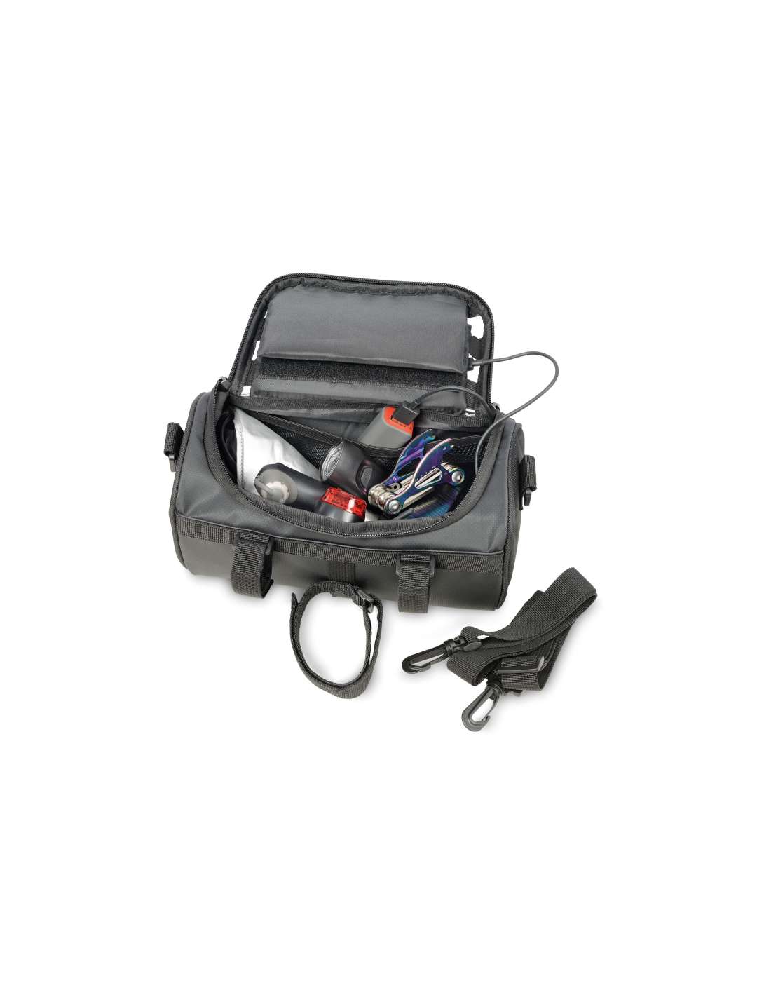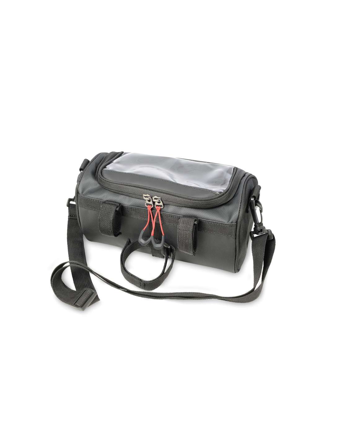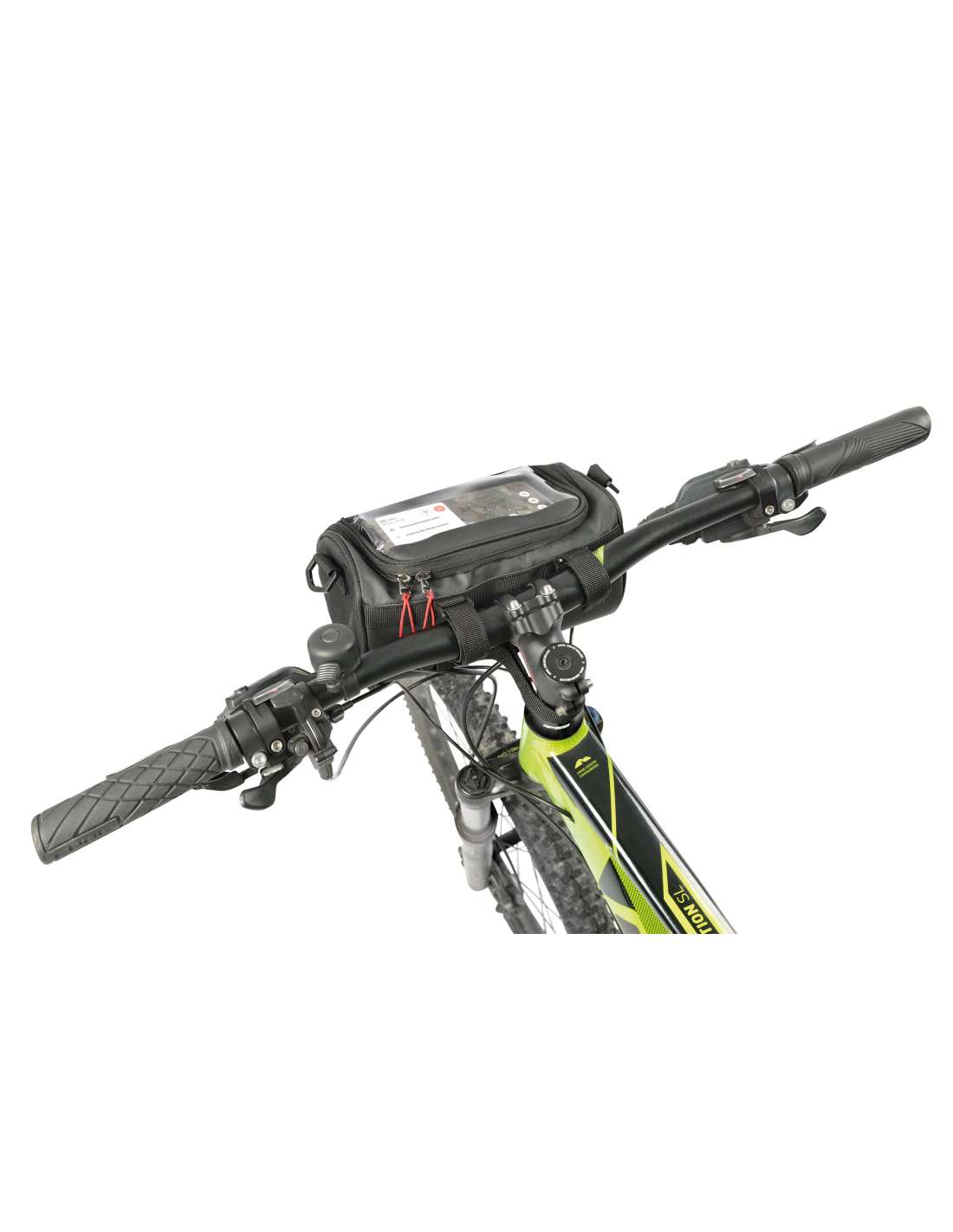 Fahrradtasche für den Lenker, flexible Befestigung mittels 3 Klettverschlussbändern am Lenker, geräumiges Hauptfach mit Reißverschluss, inkl. Netzfach (z.B.: für Powerbank), Touchscreen-Sichtfenster passend für gängige mobile Geräte zur Navigation, seitlich geöffnet zum Hauptfach (Laden via Powerbank), abnehmbarer, verstellbarer Schultergurt, Schlaufe zur Befestigung des Vorderlichts, Kapazität ca. 4 Liter, Tragkraft bis zu 5 kg, schützt Inhalt vor Spritzwasser (Wasserdichtheitsgrad IPX4) , formstabil durch verstärkte Kanten, widerstandsfähiges Material, abwaschbar, Nylon, PVC, Tarpaulin (Plane), schwarz