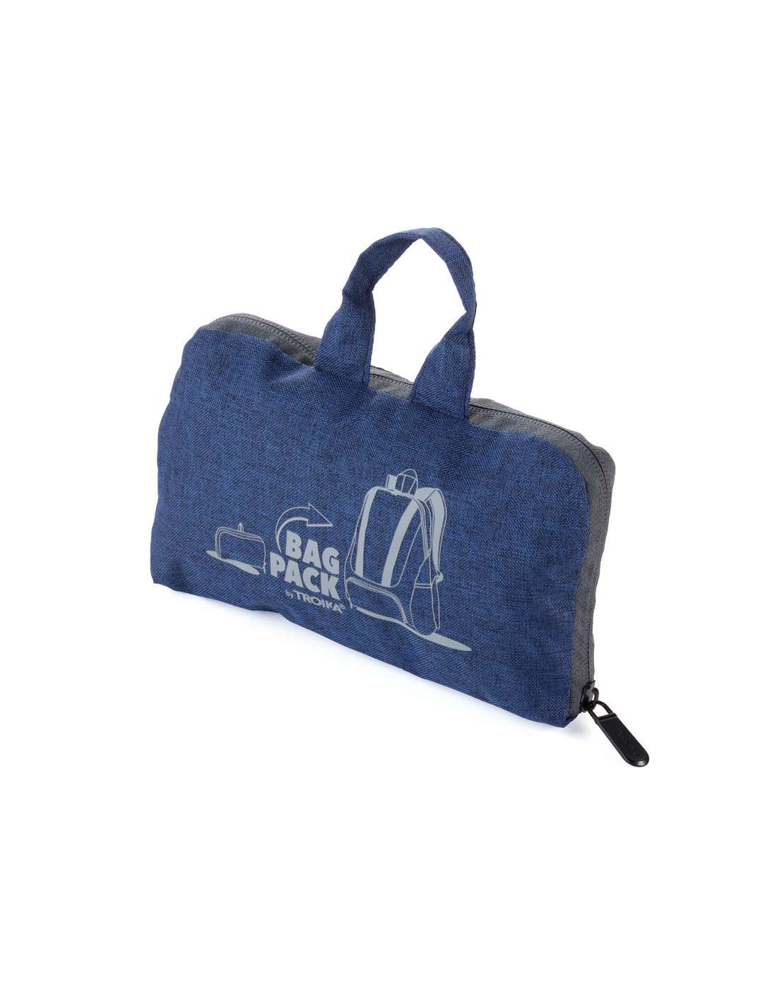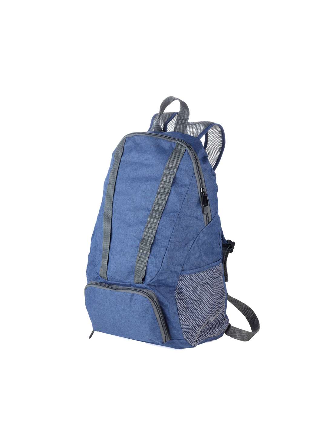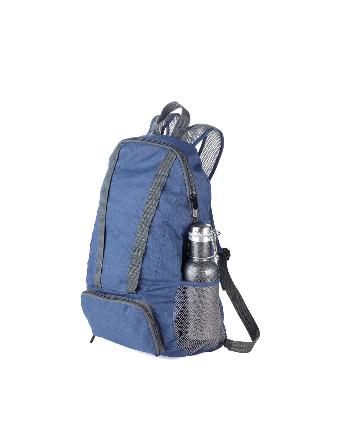 Sac à dos pliable (peut être rangé dans le compartiment extérieur pour gagner de la place), grand compartiment principal avec fermeture éclair à double sens, petite poche extérieure avec fermeture éclair, poches en filet des deux côtés, sangles d'épaule réglables en longueur, poignée de transport, capacité env. 12 litres, capacité de charge jusqu'à 15 kg, polyester, bleu foncé/gris