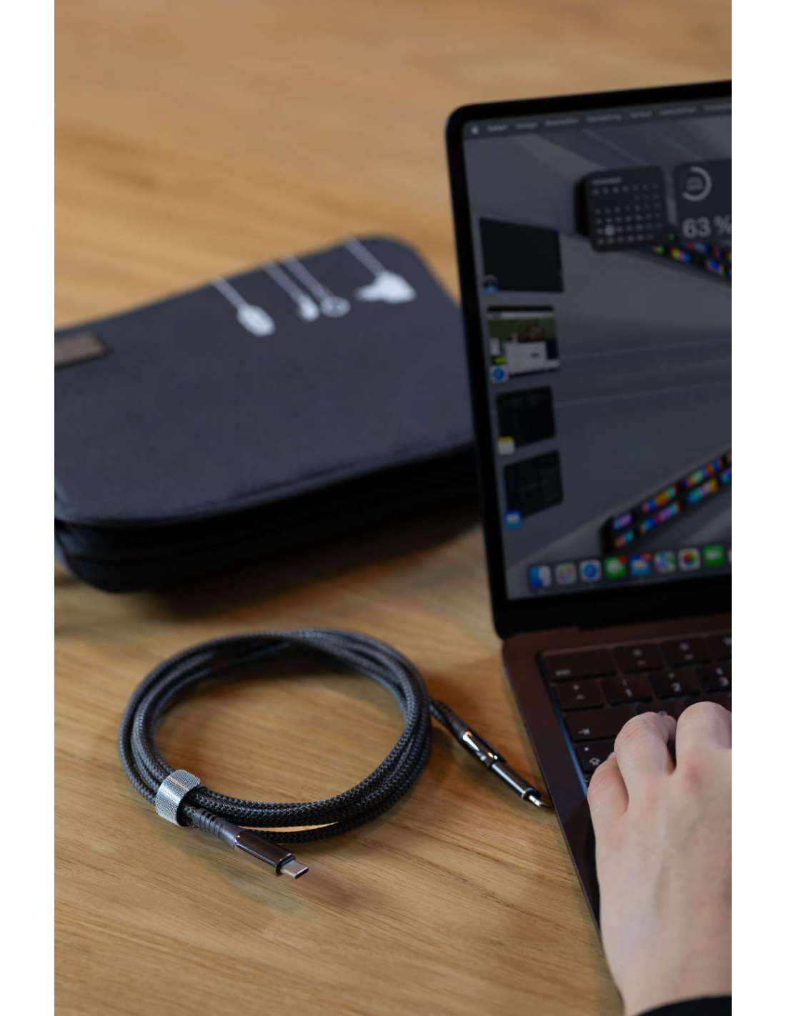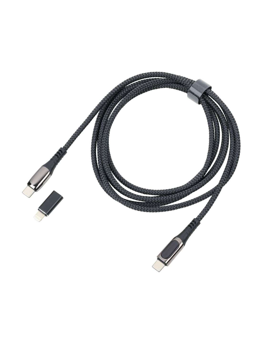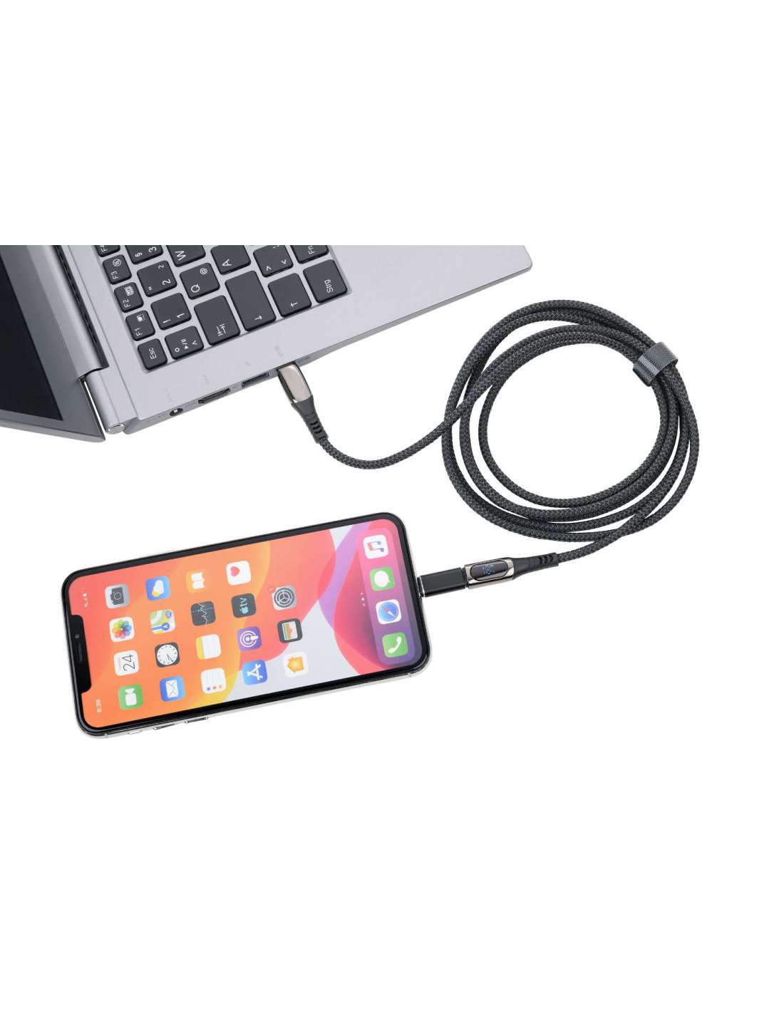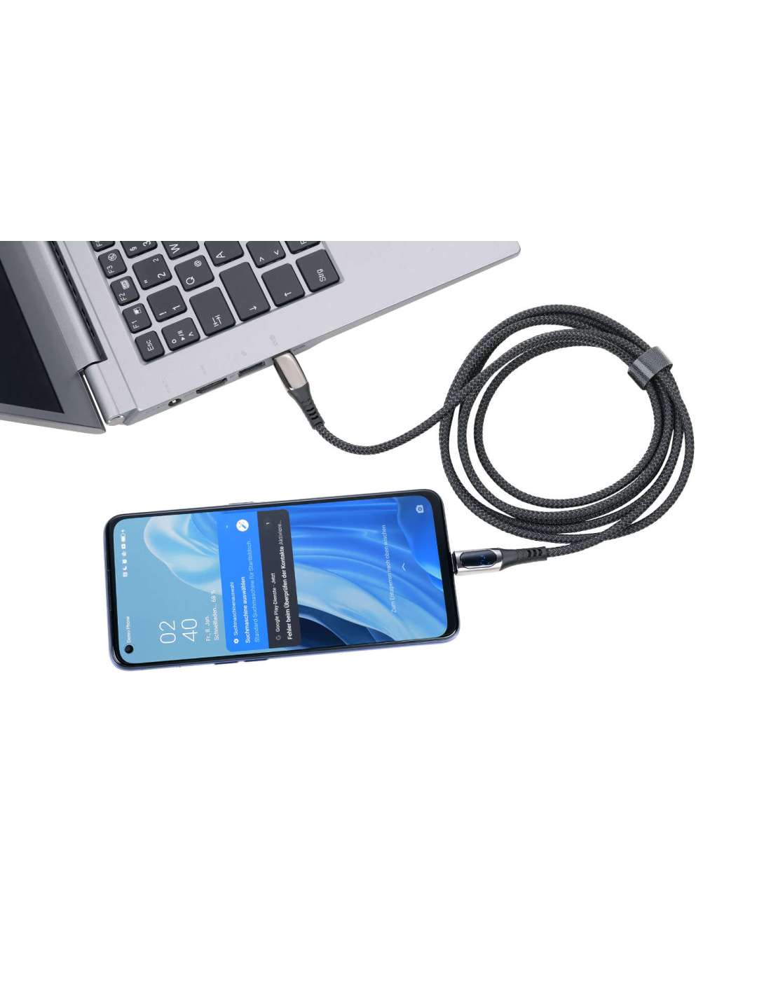 Câble de charge high-Speed USB-C 100W PD Power Delivery vers USB-C, avec fonction de transfert de données, pleine capacité de charge : max. 100W|20V|5A (sans adaptateur), en fonction de l'appareil à charger, avec affichage numérique de la puissance de charge, adaptateur USB-C vers Lightning inclus, câble gainé de textile (structure en filet), polyester recyclé, longueur 2m, métal, polyester, gunmetal/noire
